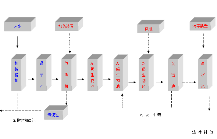 針對(duì)該項(xiàng)目具體污水水質(zhì)的特點(diǎn),本方案擬采用常規(guī)的“氣浮機(jī)(加藥)+A/O/O生物接觸氧化+消毒設(shè)備”工藝,該處理工藝較為成熟,操作運(yùn)行方便,日常費(fèi)用低廉,出水穩(wěn)定,主要設(shè)備為鋼結(jié)構(gòu),考慮到周邊環(huán)境和衛(wèi)生問題,故該污水處理工程決定采用全埋地式結(jié)構(gòu),上部覆土,種植花木、草坪,進(jìn)一步美化環(huán)境。